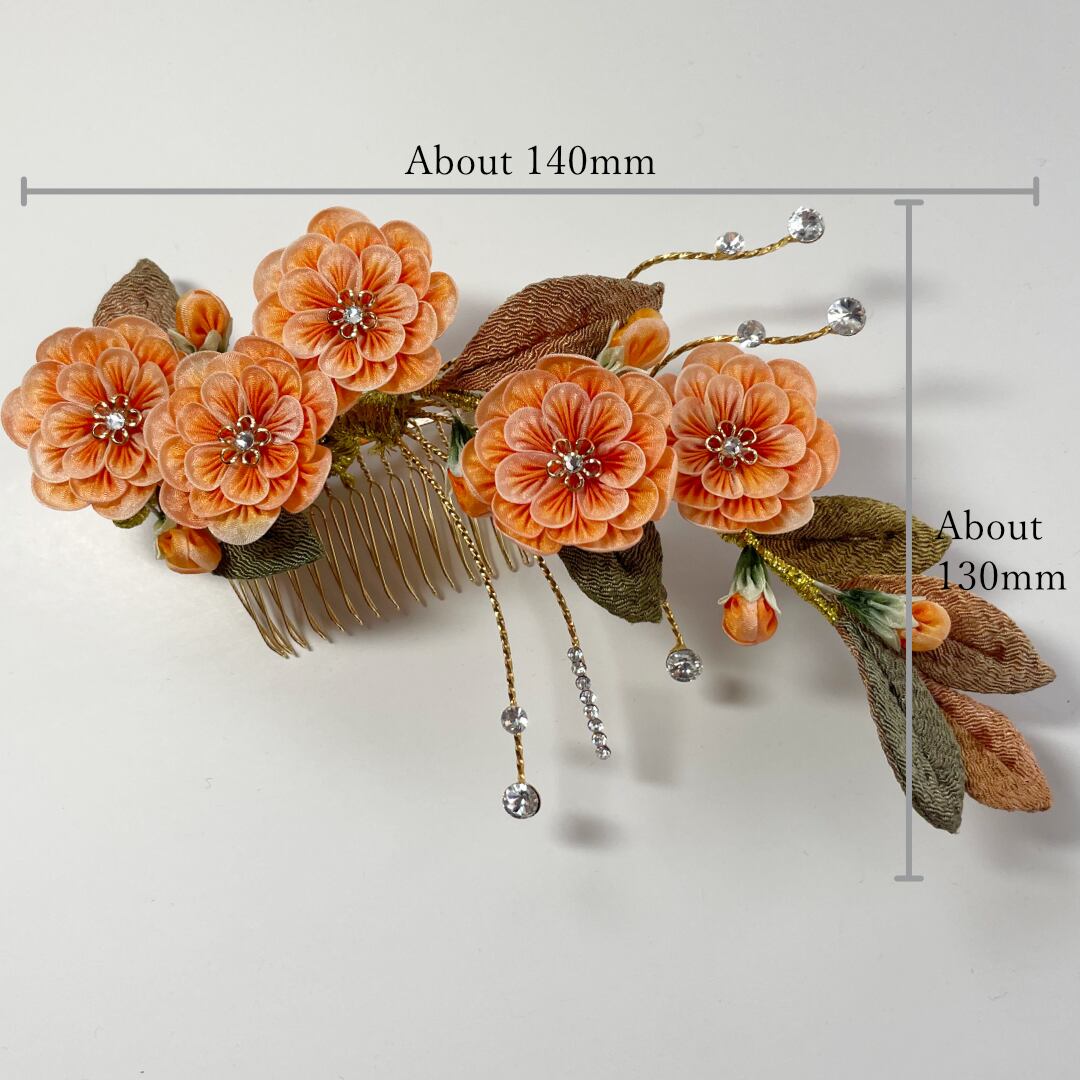 成人式、結婚式、七五三、和の装いでのお出かけを彩る菊の枝飾りつまみかんざしコームです。飾りとしてだけではなく和のインテリア小物の一品としても!サイズはコーム(幅 約140mm 縦 約130mm 高さ 約50mm)