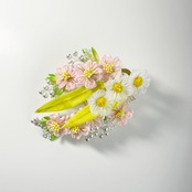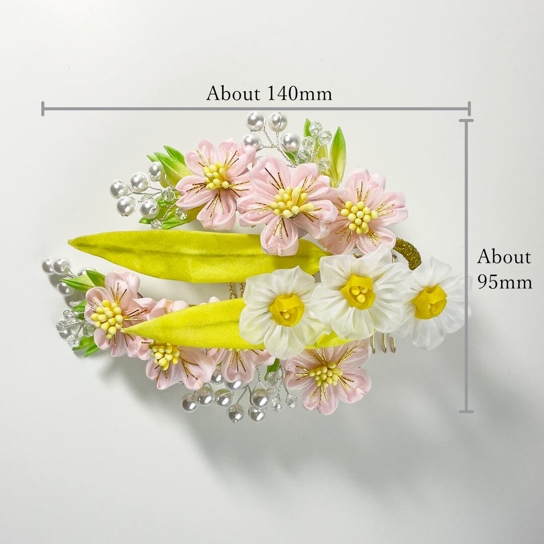 可憐な桜と清らかな水仙をモチーフにした、繊細なつまみ細工のコームです。淡いピンクと白のグラデーションが、まるで春の陽だまりのような優しい雰囲気を演出します。卒業式や入学式、結婚式など、新たな門出を祝う日にぴったりの一品です。