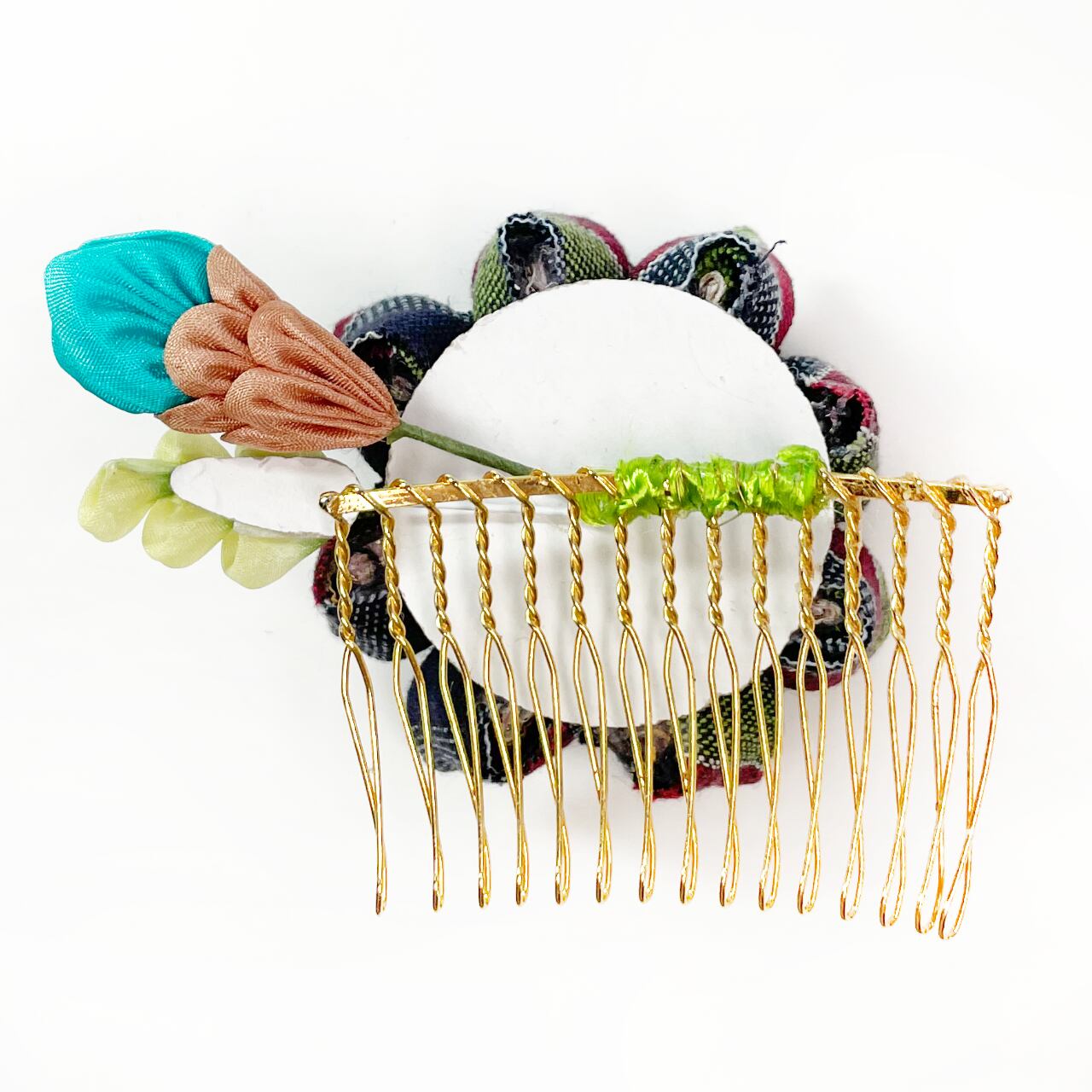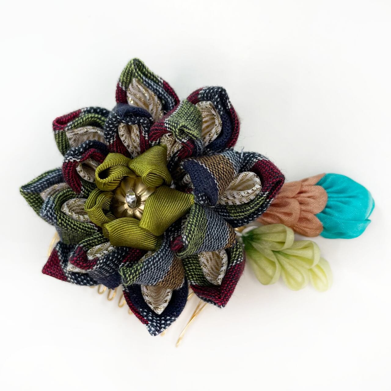 複数のグリーンとネイビーの生地を組み合わせたチェック柄風のモダンなつまみ細工コーム。落ち着いた深緑の色彩は、和装だけでなく、秋や冬の洋装にもシックに馴染みます。中心の飾りと、横から覗くアースカラーの小花が、大人の遊び心を演出します。普段のまとめ髪も、このコームを挿すだけで一瞬で華やぎます。