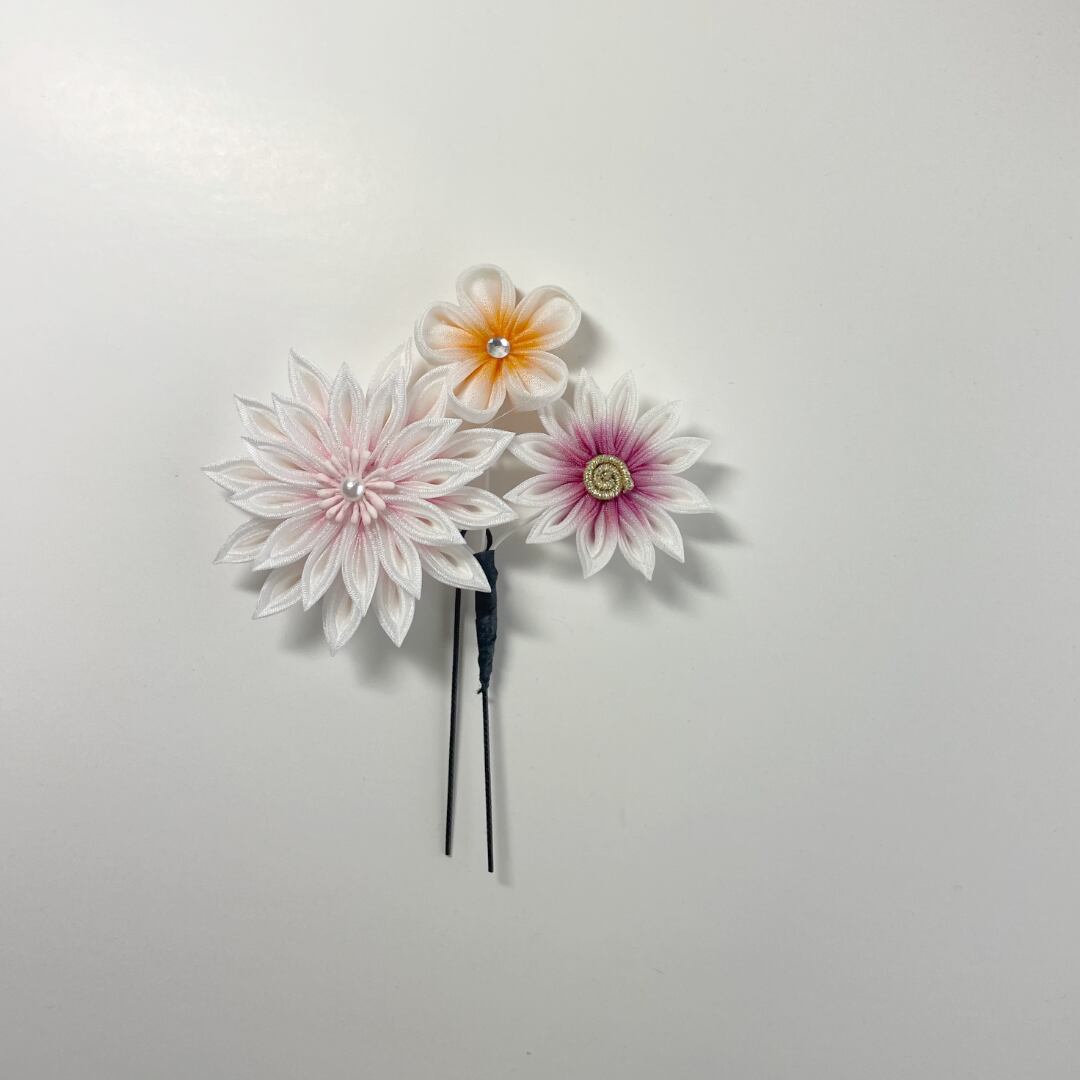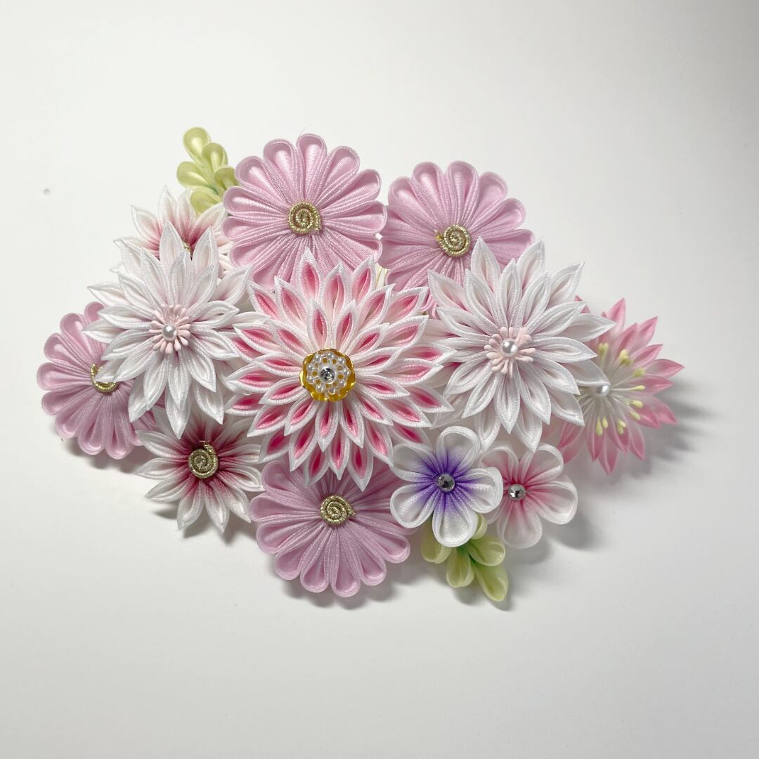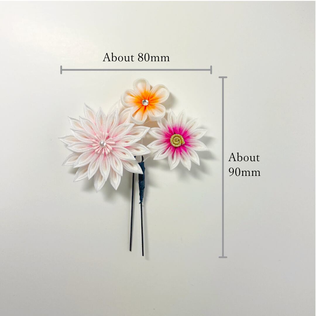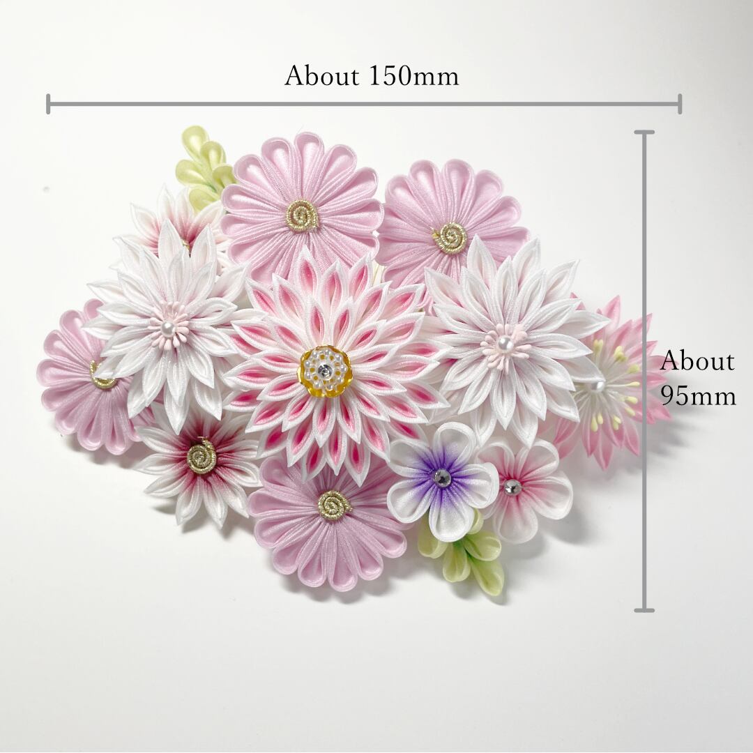 成人式、結婚式、七五三、和の装いでのお出かけを彩るつまみかんざしコームとUピンです。飾りとしてだけではなく和のインテリア小物の一品としても!サイズはコーム(幅 約150mm 縦 約95mm 高さ 約50mm)、Uピン(幅 約80mm 縦 約90mm 高さ 約20mm)。